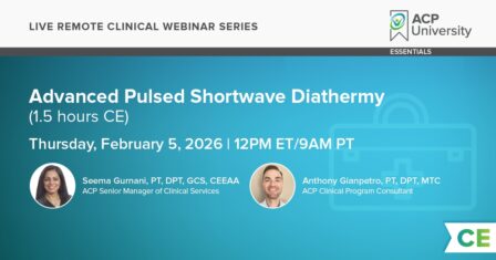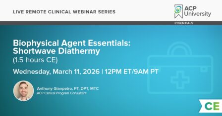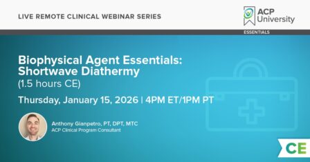 Biophysical Agent EssentialsThis one and one-half hour course is intended to provide clinicians with the most current in-depth information about shortwave diathermy. The course materials and clinical protocols presented are evidence-based and oriented to immediate clinical application of therapeutic shortwave diathermy. The lab demonstration reinforces concepts and techniques using shortwave diathermy for common treatment indications in rehab.
