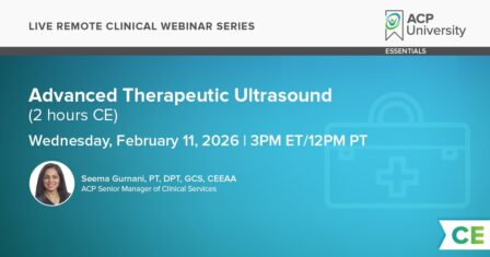 Biophysical Agent EssentialsThis two hour course is intended to provide clinicians with the most current in-depth information about ultrasound. The course materials and clinical protocols presented are evidence-based and oriented to immediate clinical application of therapeutic ultrasound. The lab demonstration provides active participation to reinforce concepts and techniques using ultrasound for common treatment indications in rehab.