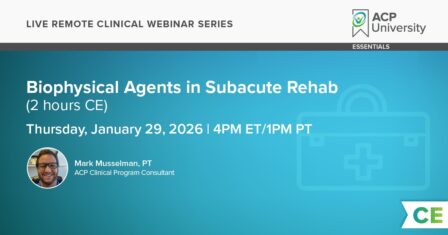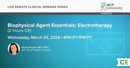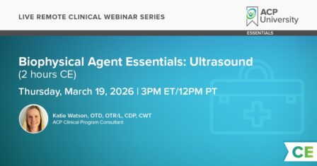 Biophysical Agent EssentialsThis two hour intermediate level course for PT/PTAs and OT/OTAs provides instruction on the treatment of subacute patients and is part of a series of Accelerated Clinical Practice courses. Through a combination of didactic lecture and lab demonstration, this course provides the individual attention necessary for clinicians to understand the unique, potential clinical benefits provided by specific therapy interventions.