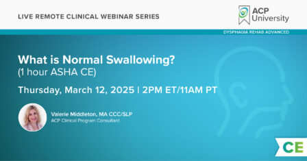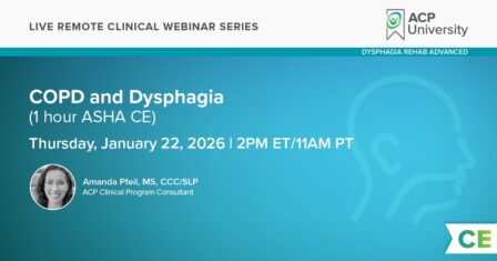 Dysphagia AdvancedThis intermediate level course for SLPs defines COPD, the different stages of the disease, and the impact on swallowing. The course reviews the physiological disadvantages of swallowing during inhalation and offers evidence-based treatment approaches for dysphagia rehab in patients with COPD.