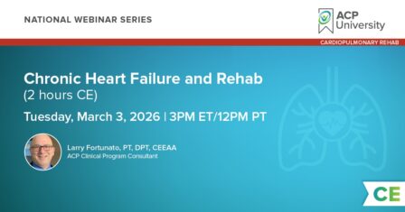CardiopulmonaryThis two hour intermediate level course for PT/PTAs and OT/OTAs provides instruction on the evidence regarding the clinical benefits of electrical stimulation, aerobic exercise, and resistive exercise to treat patient with chronic heart failure. This course is a part of a series of Accelerated Clinical Practice courses. Through a combination of didactic lecture and lab demonstrations, this course provides the individual attention necessary for clinicians to understand the unique, potential clinical benefits provided by specific therapy interventions.