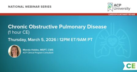 CardiopulmonaryThis one hour CE Course intermediate level course on COPD is part of a series of Accelerated Clinical Practice courses. Through a combination of lecture and lab demonstration, this course provides the individual attention necessary to achieve proficiency in the use and application of neuromuscular electrical stimulation (NMES) for COPD.