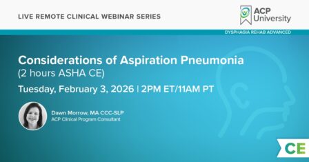Dysphagia AdvancedAspiration is a common occurrence in swallowing. Determining when aspiration becomes pathological is a multifactorial process that requires critical thinking and surveying the current evidence. This course will describe the research related to the predictors of aspiration pneumonia. In addition, the course will provide guidance concerning how to mitigate the impact of aspiration as part of comprehensive dysphagia rehab program and in the total picture of health.