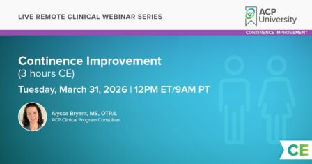Continence ImprovementThis three hour course is intended to provide clinicians with the most current in-depth information with respect to normal and compromised continence, and its assessment and treatment using electro-stimulation, therapeutic exercise and ADLs. Through a combination of didactic lecture and lab demonstration, this course provides the individual attention necessary for clinicians to understand the unique, potential clinical benefits provided by specific therapy interventions.