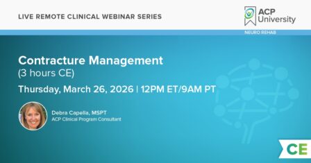 Neuro RehabThis three hour course is intended to provide clinicians with the most current in-depth information with respect to contracture assessment and treatment using biophysical agents in conjunction with orthotics. The course materials and clinical protocols prepare the clinician to design and implement skilled, evidence-based rehabilitation programs for the treatment of contractures and their impact on patient participation, activity, and functional performance.