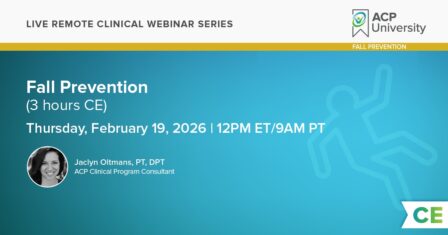 Fall and BalanceThis three hour course is intended to provide clinicians with the most current in-depth information with respect to fall prevention, assessment and treatment using biophysical agents in conjunction with therapeutic exercises, balance and ADL training. The course materials and clinical protocols prepare the clinician to design and implement skilled, evidence-based rehabilitation programs for the patient populations at risk for falls.