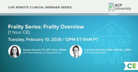 Geriatric EssentialsFrailty is a geriatric syndrome which leads to increased vulnerability to stressors, affects overall health and quality of life, and limits functional mobility and ADL/IADL. Clinical Practice Guidelines recommend interdisciplinary team management to prevent or reverse frailty. Incorporating frailty interventions and leveraging existing evidence-based strategies will facilitate optimal outcomes for residents with frailty. This course provides a review of frailty definitions, risk factors, pathophysiology, screening and assessment tools, and emphasizes the relationship between frailty and other geriatric syndromes and chronic diseases.