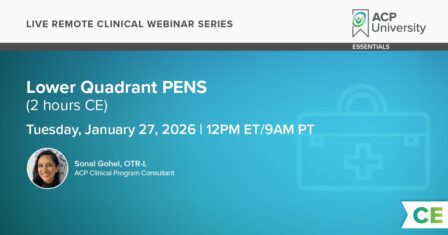 Biophysical Agent EssentialsThis intermediate level course for PT/PTAs and OT/OTAs on patterned electrical neuromuscular stimulation (PENS) is part of a series of Accelerated Clinical Practice courses. Through a didactic lecture and lab demonstration, this course provides the attention necessary to achieve proficiency in the use and application of functional and neuro re-education PENS to muscles in the Lower Quadrant. The course includes a review of literature regarding muscle activation, physiology research, and functional outcomes associated with PENS applications. Additionally, the course covers the impact of PENS on physiological impairments and how it contributes to improved patient participation, activity, and functional performance.