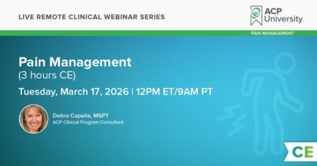 Pain ManagementThis three hour course is intended to provide clinicians with the most current in-depth information about pain management and its treatment. The course materials and clinical protocols presented are evidence-based and oriented to immediate clinical application for standard and skilled therapy for pain management. The lecture and lab demonstration reinforces concepts and techniques using biophysical agents for pain management and the impact on participation, activity, and functional performance for patients across the healthcare continuum.
