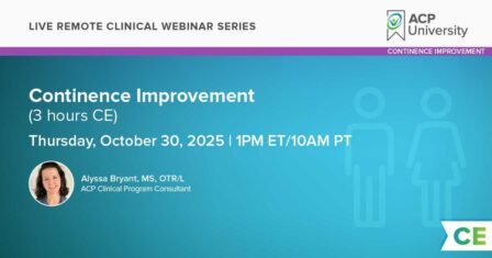 This three hour course is intended to provide clinicians with the most current in-depth information with respect to normal and compromised continence, and its assessment and treatment using electro-stimulation, therapeutic exercise and ADLs. The course materials and clinical protocols prepare the clinician to design and implement skilled, evidence-based rehabilitation programs for the treatment of urinary incontinence.