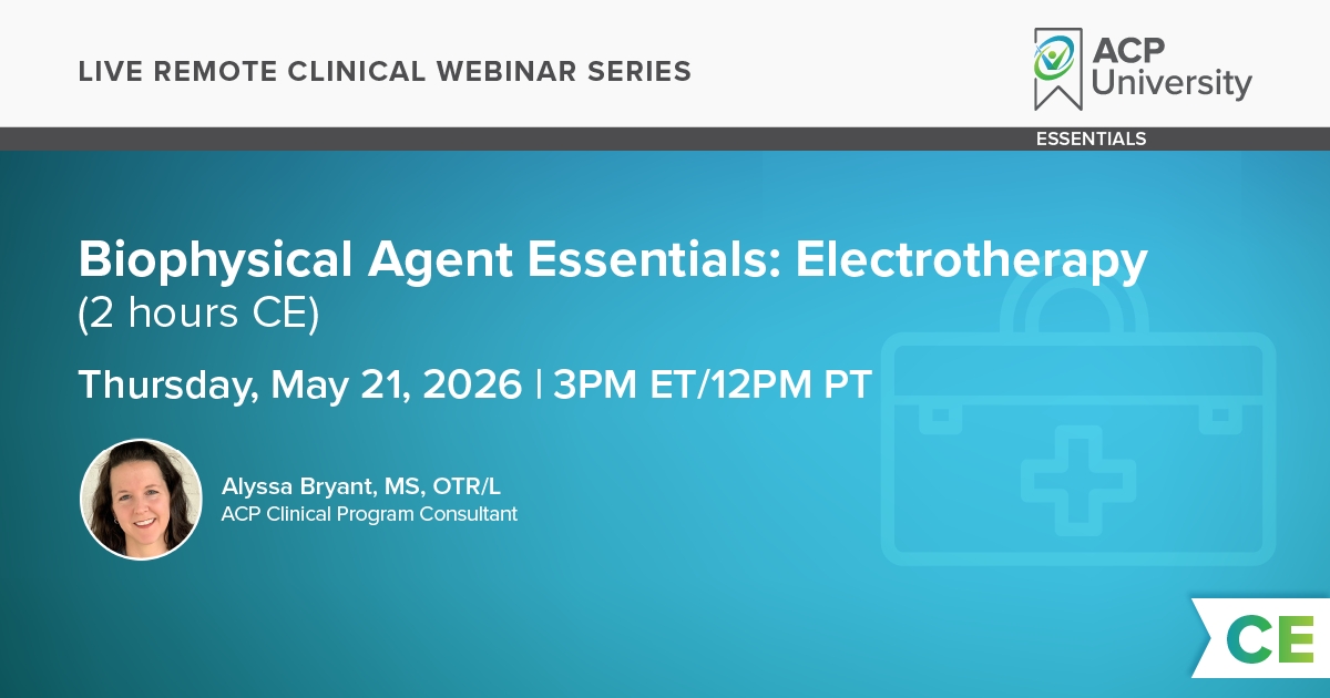 05/21/2026 03:00 PM 05/21/2026 05:00 PM America/New_York Biophysical Agent Essentials- Electrotherapy  This two hour course is intended to provide clinicians with the most current in-depth information about ultrasound. The course materials and clinical protocols presented are evidence-based and oriented to immediate clinical application of therapeutic ultrasound. The lab demonstration provides active participation to reinforce concepts and techniques using ultrasound for common treatment indications in rehab.