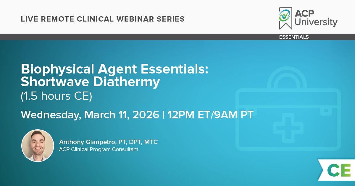 This one and one-half hour course is intended to provide clinicians with the most current in-depth information about shortwave diathermy. The course materials and clinical protocols presented are evidence-based and oriented to immediate clinical application of therapeutic shortwave diathermy. The lab demonstration reinforces concepts and techniques using shortwave diathermy for common treatment indications in rehab.