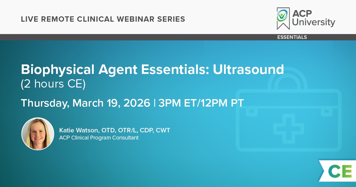 This two hour course is intended to provide clinicians with the most current in-depth information about ultrasound. The course materials and clinical protocols presented are evidence-based and oriented to immediate clinical application of therapeutic ultrasound. The lab demonstration provides active participation to reinforce concepts and techniques using ultrasound for common treatment indications in rehab.