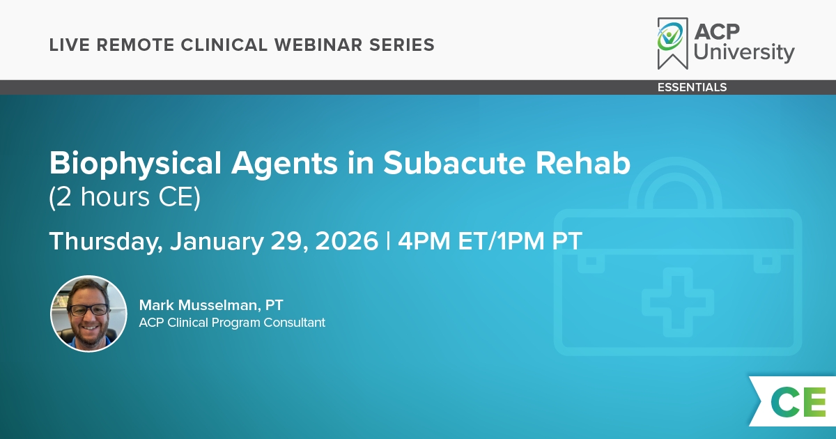 This two hour intermediate level course for PT/PTAs and OT/OTAs provides instruction on the treatment of subacute patients and is part of a series of Accelerated Clinical Practice courses. Through a combination of didactic lecture and lab demonstration, this course provides the individual attention necessary for clinicians to understand the unique, potential clinical benefits provided by specific therapy interventions.