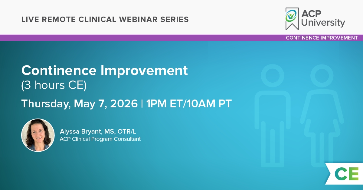 This three hour course is intended to provide clinicians with the most current in-depth information with respect to normal and compromised continence, and its assessment and treatment using electro-stimulation, therapeutic exercise and ADLs. Through a combination of didactic lecture and lab demonstration, this course provides the individual attention necessary for clinicians to understand the unique, potential clinical benefits provided by specific therapy interventions.