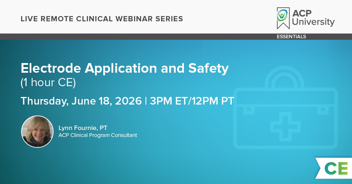 Through a combination of didactic lecture and lab demonstration, this course provides the attention necessary for clinicians to understand the use and safe application of electrodes for pain management and neuromuscular electrical stimulation.