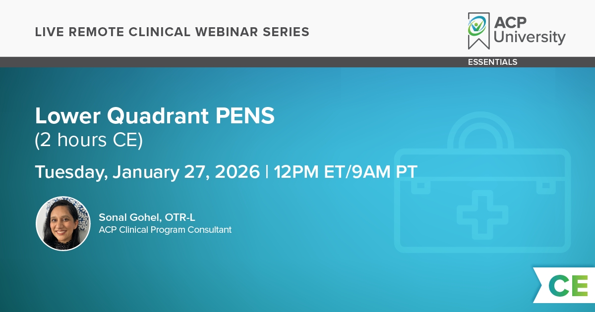 This intermediate level course for PT/PTAs and OT/OTAs on patterned electrical neuromuscular stimulation (PENS) is part of a series of Accelerated Clinical Practice courses. Through a didactic lecture and lab demonstration, this course provides the attention necessary to achieve proficiency in the use and application of functional and neuro re-education PENS to muscles in the Lower Quadrant. The course includes a review of literature regarding muscle activation, physiology research, and functional outcomes associated with PENS applications. Additionally, the course covers the impact of PENS on physiological impairments and how it contributes to improved patient participation, activity, and functional performance.