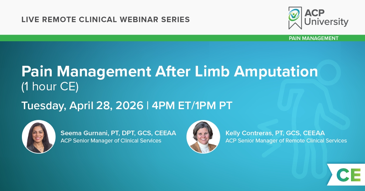 This one hour CE course is intended to provide clinicians with the most current in-depth information about pain management after limb amputation. The lecture will reinforce concepts and information related to the prevalence of amputation, importance of collaborative care, physiology and characteristics of pain including types of pain following amputation and treatment options. The course content and clinical protocols are evidence-based and oriented to immediate clinical applications impacting patient activity performance and participation in mobility and social roles.