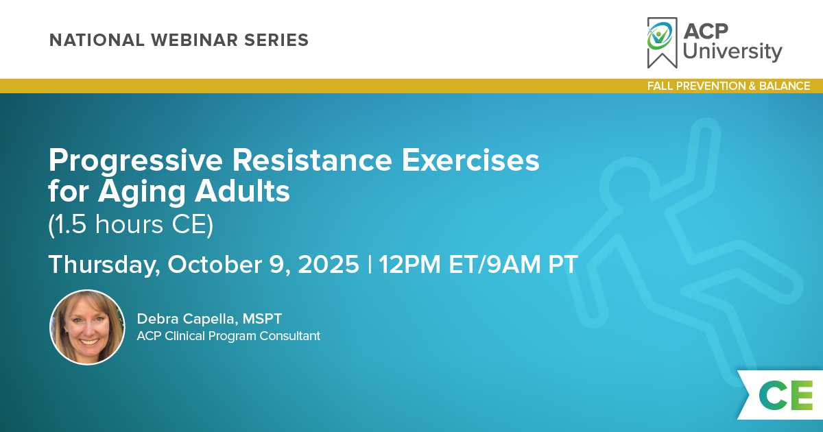 Elastic bands and free weights are common modes of resistance exercise. They are used in virtually every therapy setting and frequently in patient home exercise programs. This intermediate level course for PT/PTAs and OT/OTAs is part of a series of Accelerated Clinical Practice courses. Through a combination of small class size and hands on experience, this course provides the individual attention necessary for clinicians to understand how to apply optimal progressive resistance exercise (PRE) protocols using elastic bands and other tools to geriatric patients in a safe, efficacious, and time-efficient manner.