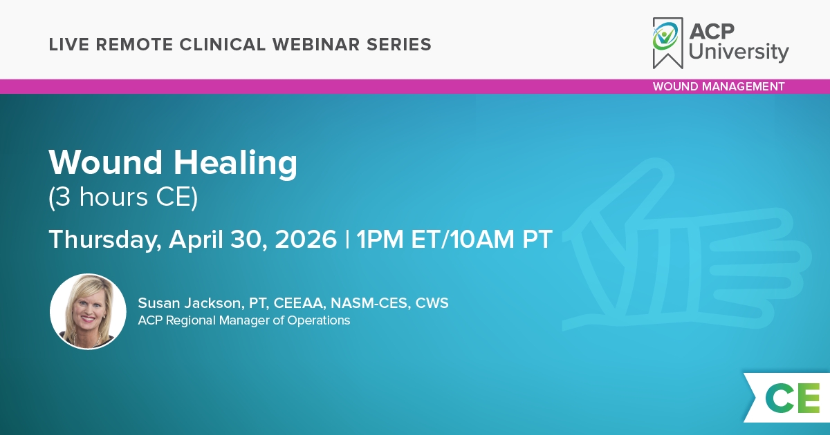 This three hour course is intended to provide clinicians with the most current in-depth information about chronic wounds and their treatment. The course materials and clinical protocols presented are evidence-based and oriented to immediate clinical application for standard and skilled therapy for chronic wound healing. The lab demonstration will reinforce concepts and techniques integrating biophysical agents to accelerate wound healing and positively impact participation, activity, and functional performance.