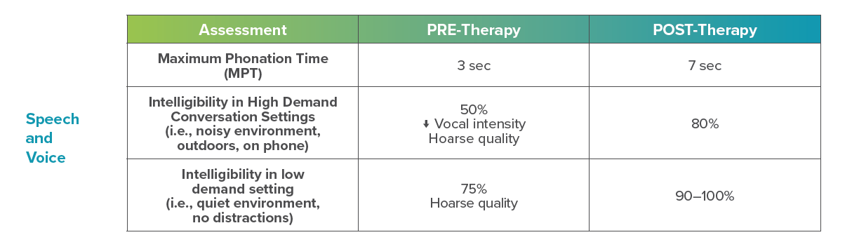 The patient and his significant other were happy that through therapy, he was able to regain his confidence and clarity of speech. The patient was able to engage in social activities he had avoided, such as talking on the phone, speaking around others at the rehab gym, and conversing with unfamiliar people.